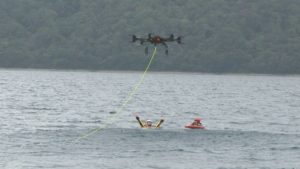 昨今の大雨・ゲリラ豪雨による、川や湖での水難事故を想定した救出・救助訓練において、ドローンで水に浮かぶ救助用ロープや浮輪、20kgとなるブイの投下を行い、特別救助隊員の方との連携による共同訓練を行いました。